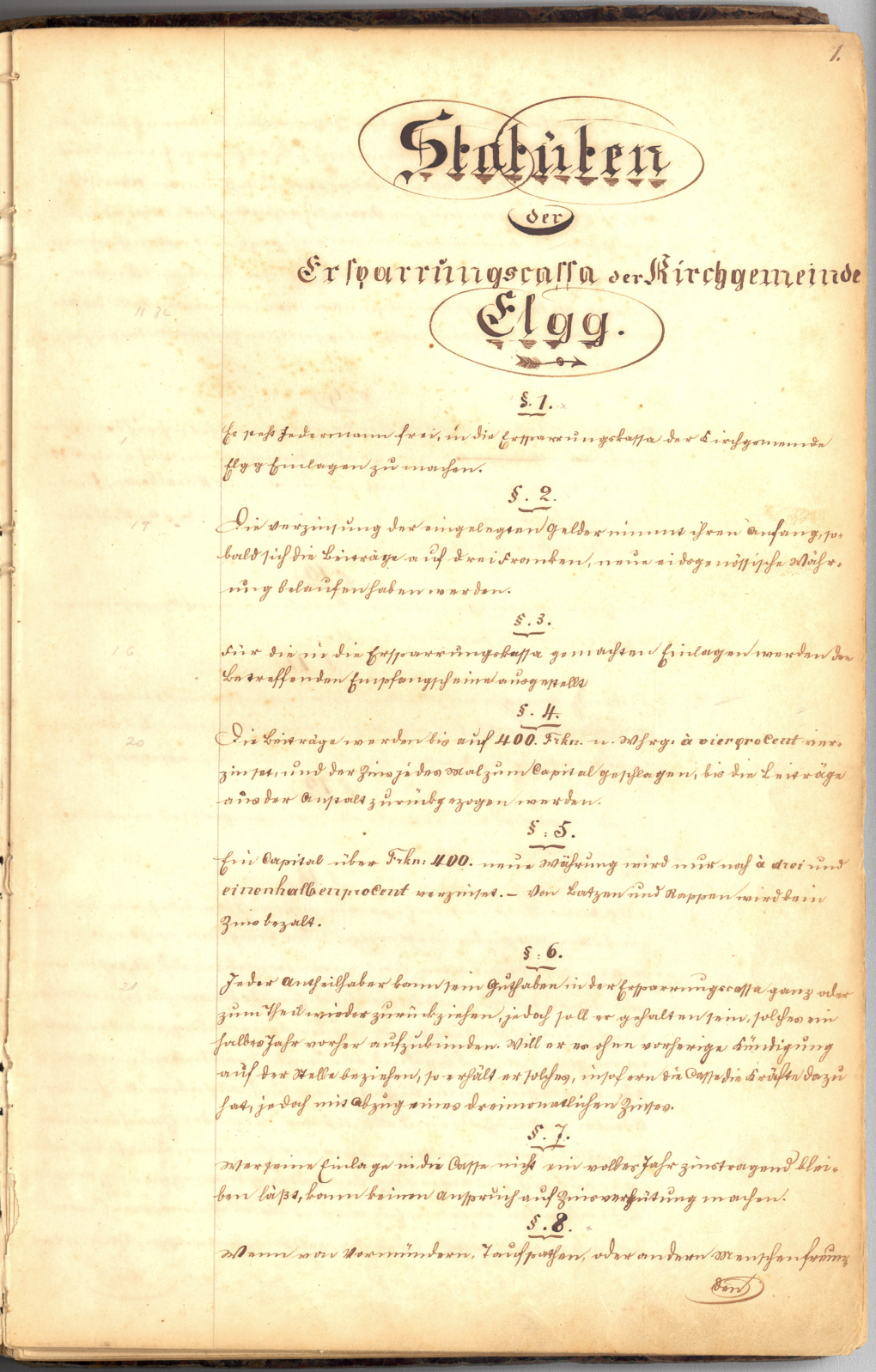 Auszug erste Statuten der «Ersparrungscassa der Kirchgemeinde Elgg» von 1851. Quelle: Archiv ZLB